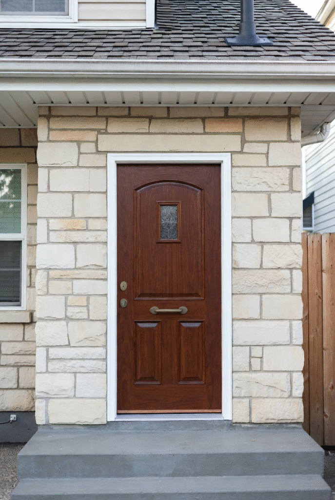 Matinis stiklas yra populiariausias pasirinkimas, nes jis praleidžia šviesą, bet išskaido vaizdą taip, kad matomi tik siluetai. Tai suteikia prieškambariui erdvės pojūtį, apšviečia patalpą dienos metu, tačiau visiškai apsaugo gyventojų privatumą. Estetiniu požiūriu stiklo intarpai suteikia fasadui modernumo ir lengvumo, o tinkamai parinkta forma (siaura vertikali juosta, horizontalūs elementai ar arkos) gali tapti pagrindiniu namo eksterjero akcentu.